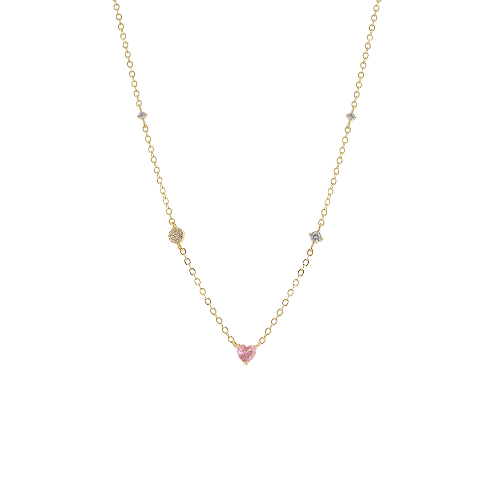 Κολιέ Happy Hearts μεταλλικό επίχρυσο με ροζ καρδιά και λευκά ζιργκόν